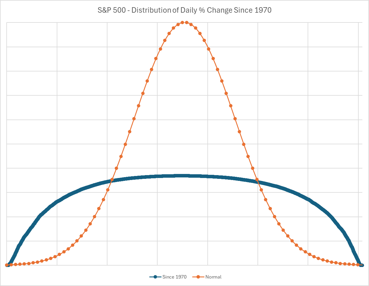 The below, which shows the distribution of the daily % change in the S&P 500 over the last 5 decades helps to evidence this point. The curve is much flatter, with much wider ‘tails’, than the normal distribution plotted in orange.