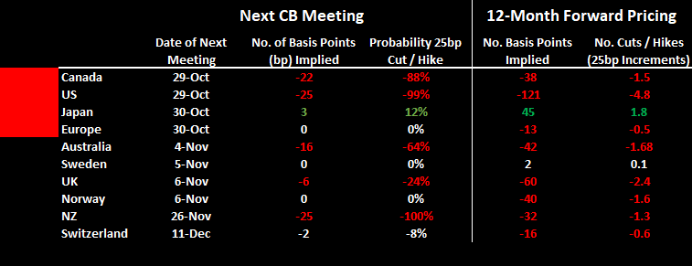 A huge week for global monetary policy as four major G10 central banks — the Federal Reserve, Bank of Canada, European Central Bank, and Bank of Japan — hold meetings. Fed & BoC: Interest-rate swaps imply a 25bp rate cut from each. ECB & BoJ: Both are expected to hold policy steady. The BoC meeting offers the greatest potential surprise versus market pricing, though the FOMC meeting will command global trader attention.
