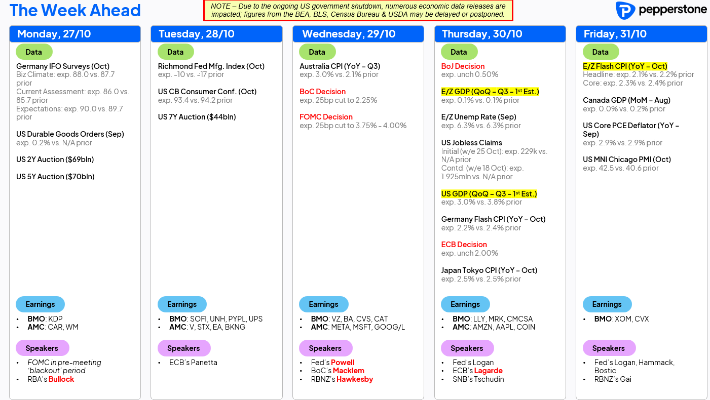 Beyond U.S.–China trade, it’s a big week ahead, with the calendar packed with scheduled event risk. We break down the main events below.