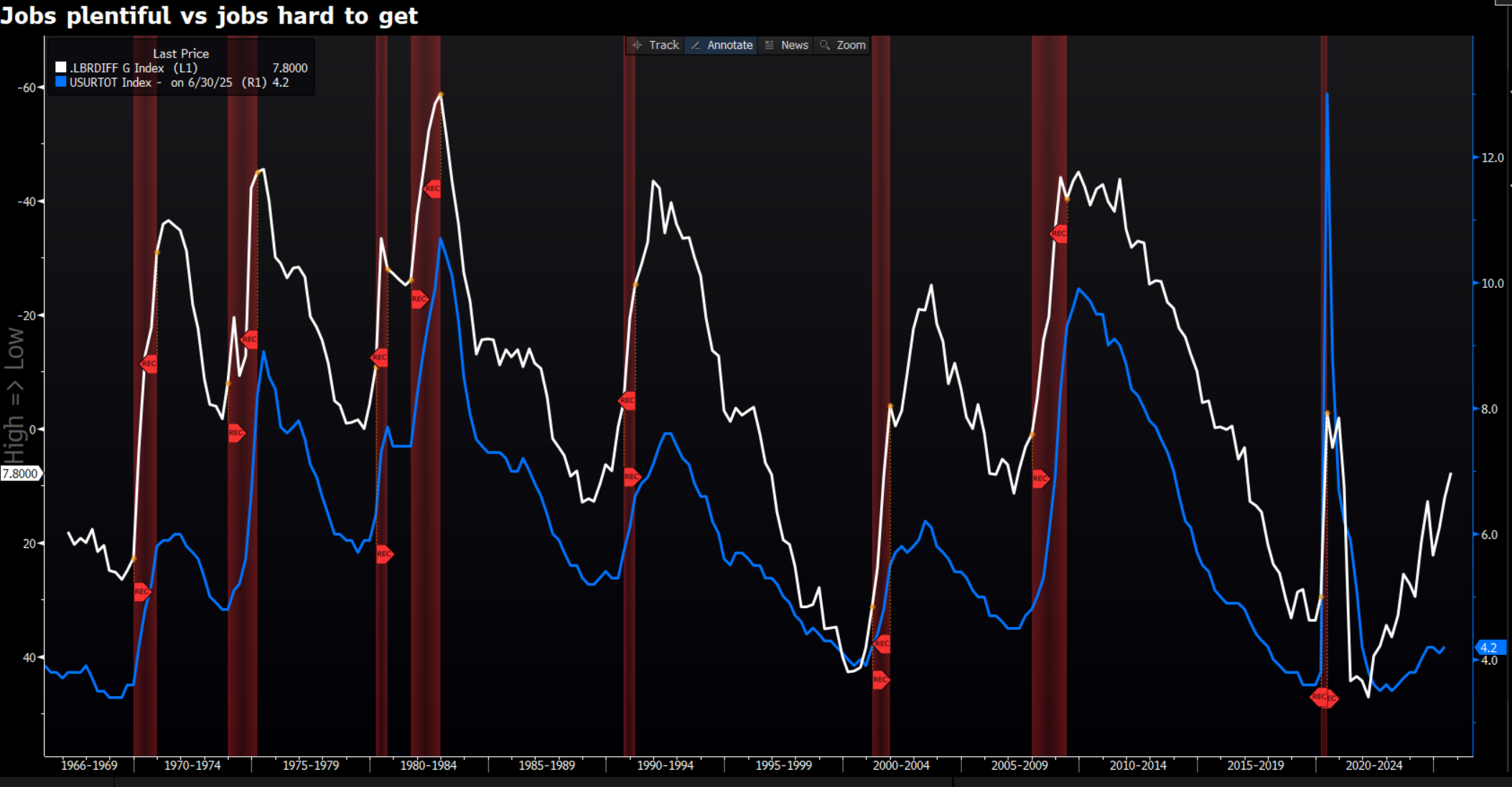 Labour Market Signal While not typically a volatility driver, the Conference Board Consumer Confidence Index offers a crucial insight — the “Jobs Plentiful vs. Jobs Hard to Get” spread, also known as the Labour Market Differential. This metric has historically led trends in U.S. unemployment rate. With “Jobs Hard to Get” now at its highest level since Feb 2021, traders may interpret it as a leading indicator of rising unemployment — and potential dovish tilt in Fed expectations.