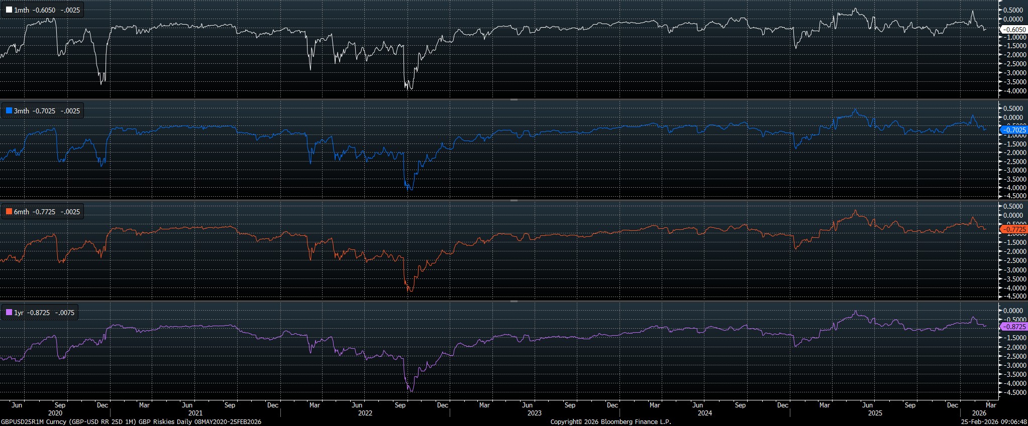As for the pound, those same downside risks also dominate the near- and medium-term outlooks, though it must be said that sentiment towards sterling is already relatively soft, with cable risk reversals across a host of tenors trading at their most negative since mid-November last year.