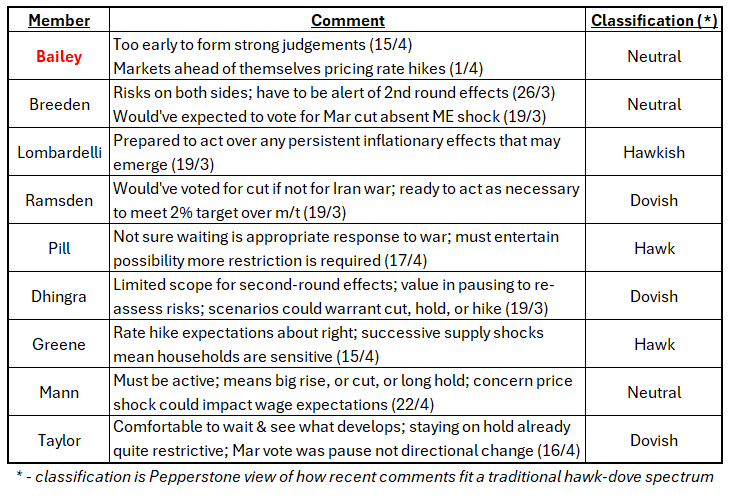 This time around, another unanimous decision seems likely, judging by recent comments from MPC members, as detailed in the table below. In fact, it’s noteworthy that we have heard considerably more from ratesetters in the period since the March meeting, than we did in the run-up to it, perhaps a sign that the MPC have learnt their lesson in that one of the main reasons for such a violent market reaction last month was that participants had had little-to-no indication of how policymakers were viewing the outlook in advance of the surprisingly hawkish policy statement being released.