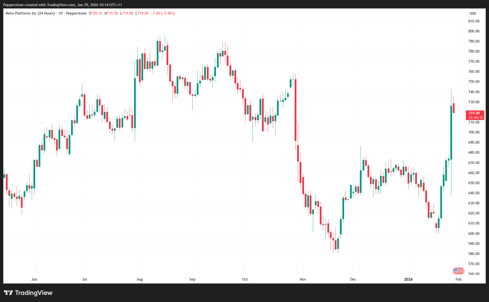 Whether the market truly ‘falls in love’ with Meta stock and drives a sustained trend higher remains the central question. Near-term price action should provide important clues. Watch Meta’s 24-hour CFD during the Asia session. A break above $745 would be a strong signal that investors are prepared to chase the stock higher.