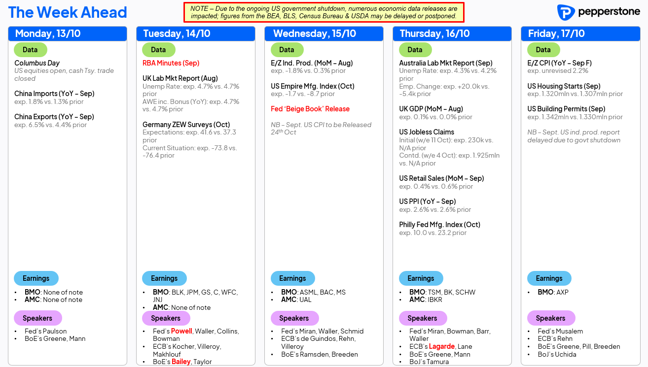 LOOK AHEAD – Quite clearly, trade developments are set to dominate the upcoming week, especially as the continuing US government shutdown means that markets will continue to operate in a data vacuum.
