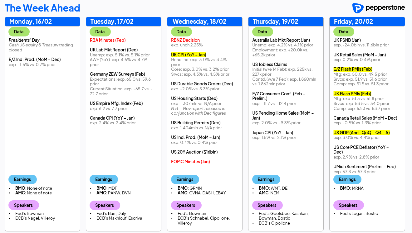 The US observes Presidents’ Day, with US cash equities and Treasuries closed today and futures trading on reduced hours. China’s Lunar New Year begins on Tuesday, which will impact mainland China and Hong Kong cash and derivatives markets through the week, and given the impact Shanghai gold futures have recently had on the CME gold futures through Asia, this could reduce gold volatility through Asian trade. UK school holidays also begin, potentially reducing participation. Whether these holiday dynamics meaningfully reduce liquidity remains to be seen, but thinner conditions can amplify price moves, particularly around event risk.
