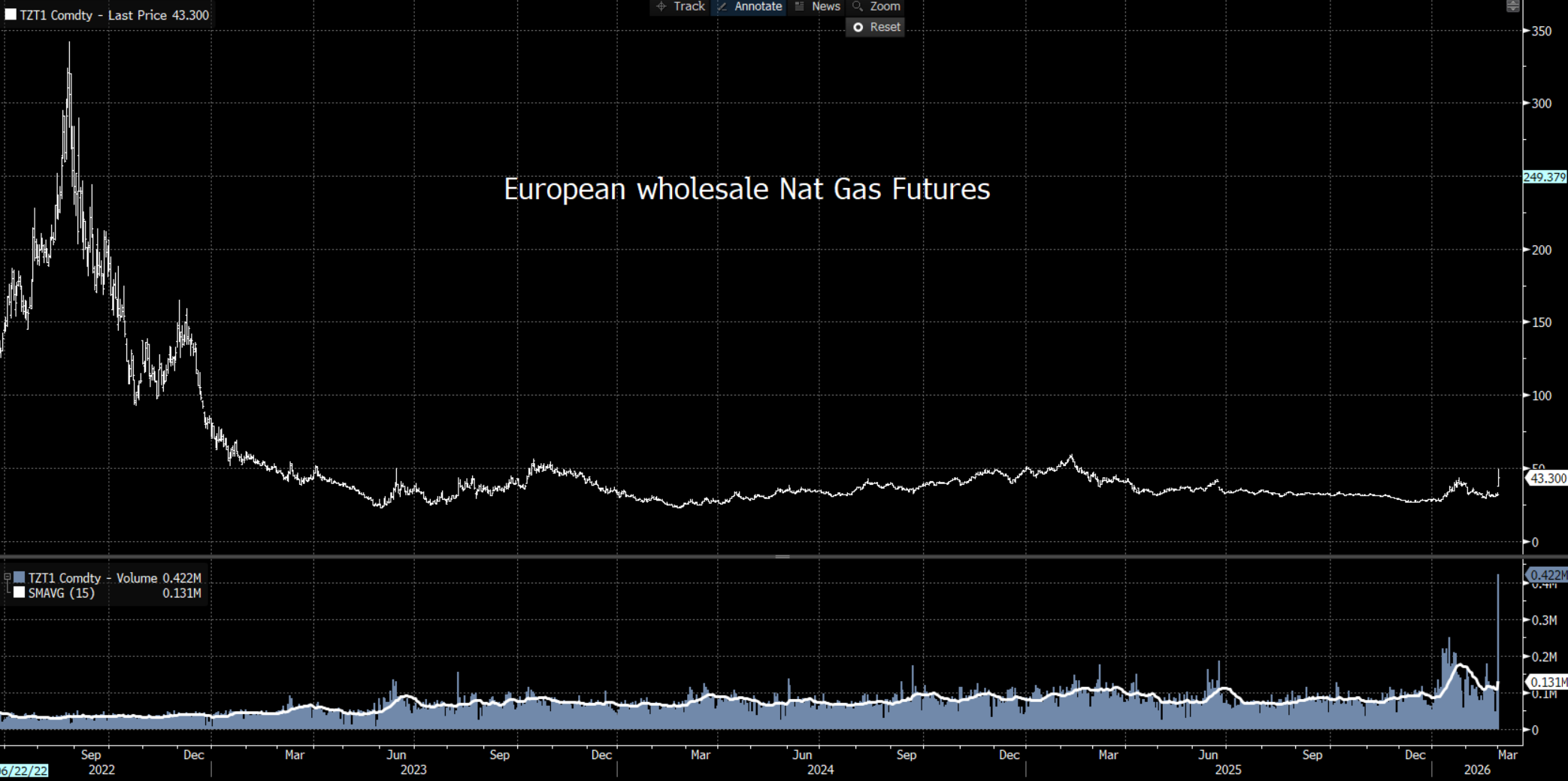 Another key development is the 39% surge in European natural gas prices. Granted, at 43 (€ / MWh) the levels are still well below what we saw in 2022, and we know this market can be highly volatile, but should this kick higher then it could see the (inverse) relationship with the EUR build.