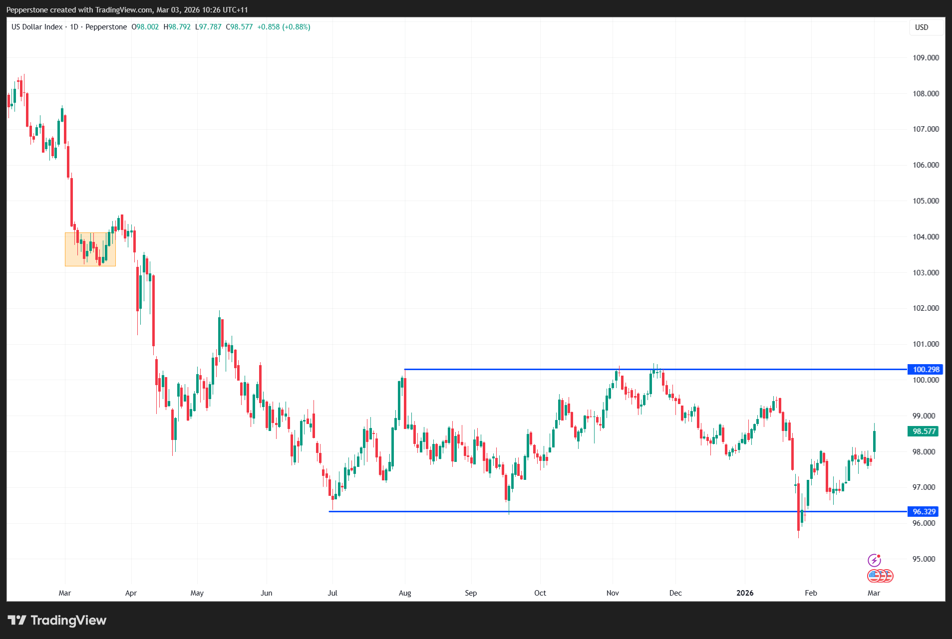 The US Dollar Index (USDX) lifted from 97.80 and trended steadily higher toward 98.75, where it has since consolidated in choppy trade. On the day, the US dollar outperformed all G10 peers, surprising many participants. Technically, the Dollar Index has broken above the 98 range highs and closed above its 50-day, 100-day and 200-day moving averages. The question now is whether momentum can extend toward 100, especially with EURUSD trading below the 19 Feb lows of 1.1742 and closing under 1.1700.
