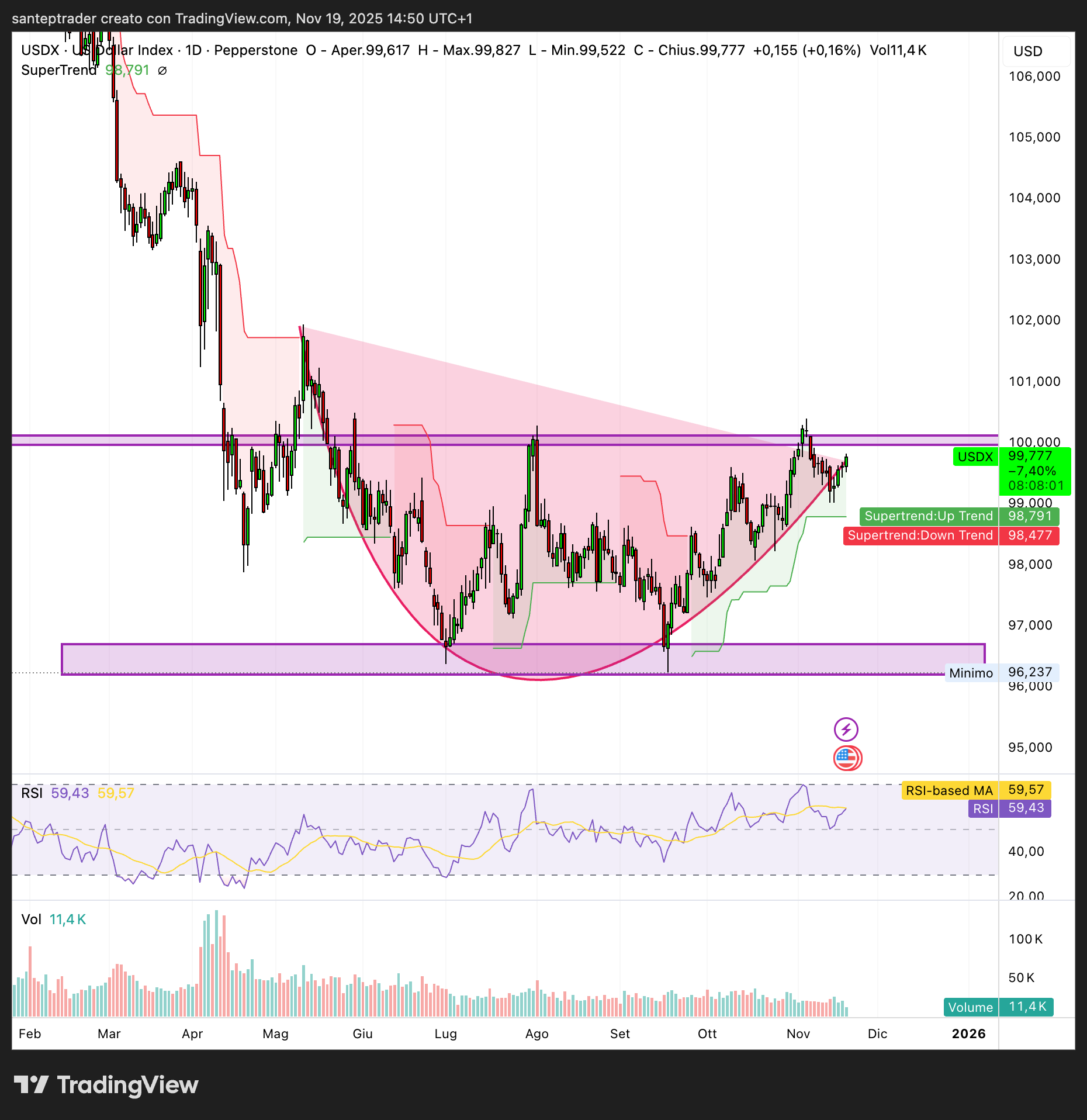 Il Dollar Index oscilla intorno a quota 99,6–99,7 il 19 novembre 2025, in rialzo di circa lo 0,15% sull’ultima seduta ma in calo significativo su base annua, segnale di un indebolimento strutturale del biglietto verde.